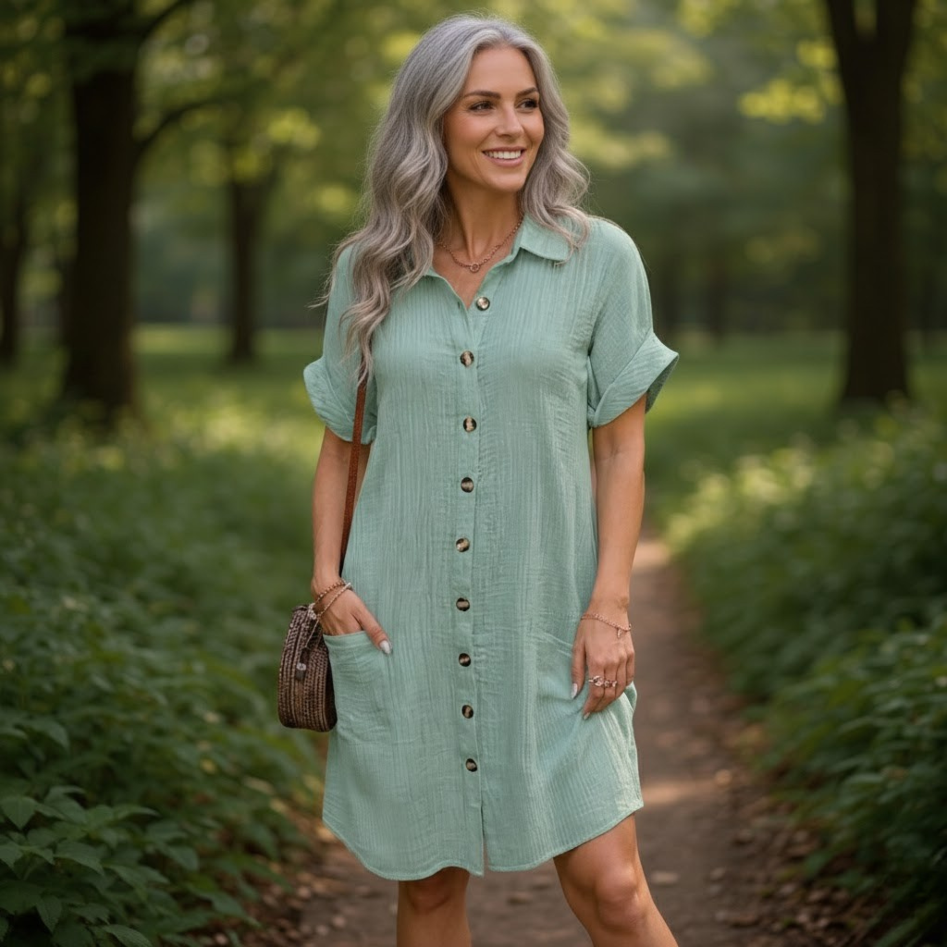 Feel confidently comfortable in the Stella Casual Button Dress, a piece designed with real women in mind. The relaxed fit skims gently over the body without clinging, creating a smooth, flattering shape that feels good from morning to evening.